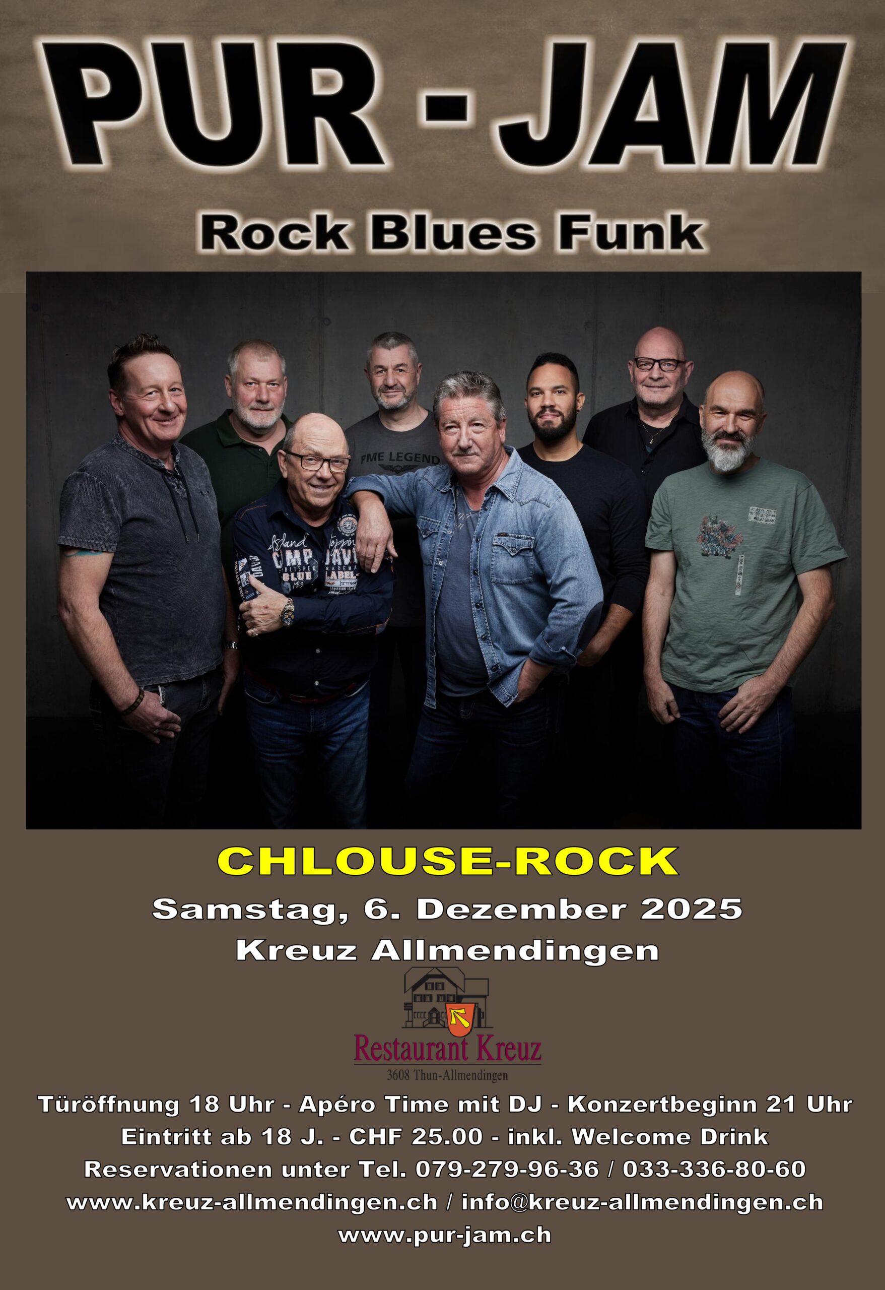 Mir freue üs, dass mir am Samschtig 6. Dezämber 2025 zum 9te Mal zum Chlouse-Rock dörfe ufschpile…..bi Mosers Tom u Claudia im super schöne grosse Saal.