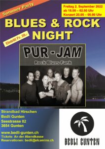 Auso Lüt, äs isch Summer u Zyt für di 14. Blues & Rocknight mit PUR-JAM im Bedli z’Gunte.