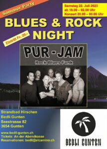 Auso Lüt, äs isch Summer u Zyt für di 15. Blues & Rocknight mit PUR-JAM im Bedli z’Gunte.